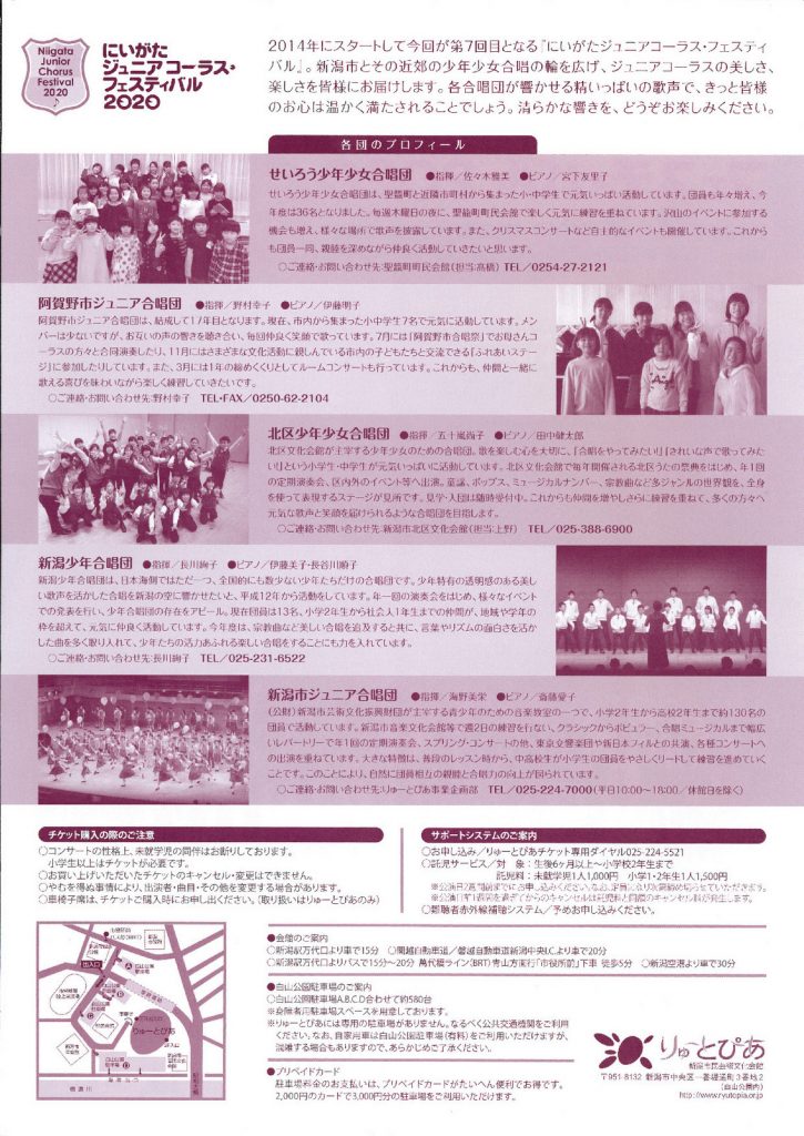 にいがたジュニアコーラス・フェスティバル20202020.2/2(日)会場:りゅーとぴあコンサートホール裏面あり。 中央区 permalink こんな演奏会も。(終了したものもあります)関連したものがみつかりませんでした