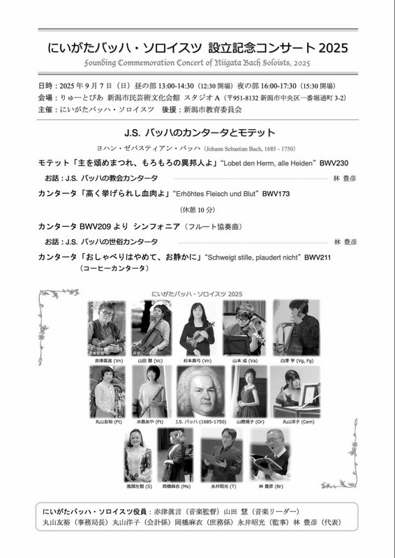にいがたバッハ・ソロイスツ設立記念コンサート20252025.9/7(日)会場:りゅーとぴあスタジオA裏面あり 中央区, チケット取扱 permalink こんな演奏会も。(終了したものもあります)関連したものがみつかりませんでした