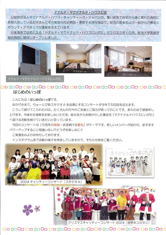 はじめのいっぽ チャリティーコンサート2025.7/21(月)会場:りゅーとぴあスタジオA裏面あり。要予約 中央区, 無料 permalink こんな演奏会も。(終了したものもあります)関連したものがみつかりませんでした