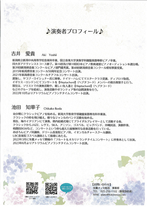 アトリウムピアノ ランチタイムコンサート2024.6/5(水)会場:朱鷺メッセ アトリウム裏面あり 中央区, 無料 permalink こんな演奏会も。(終了したものもあります)関連したものがみつかりませんでした
