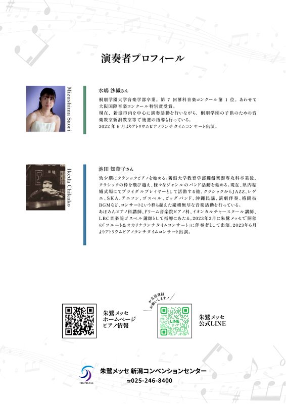 アトリウムピアノ ランチタイムコンサート2025.9/10(水)会場:朱鷺メッセ アトリウム裏面あり 中央区, 無料 permalink こんな演奏会も。(終了したものもあります)関連したものがみつかりませんでした
