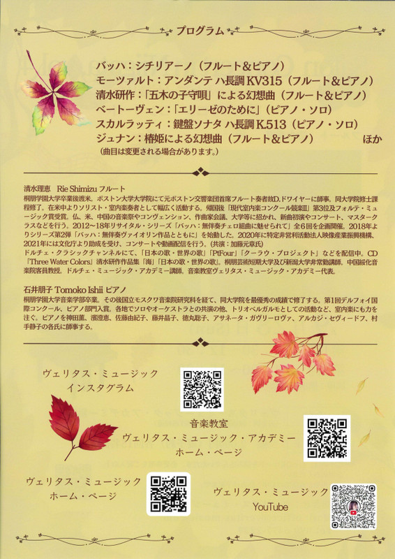 サロン・コンサート・ニイガタvol.42025.9/28(日)会場:ヴェリタス・ミュージック・アカデミー新潟裏面あり。 1回目と2回目は満員。急遽3回目16:30が決まりました。いかがでしょうか。 中央区 permalink こんな演奏会も。(終了したものもあります)関連したものがみつかりませんでした
