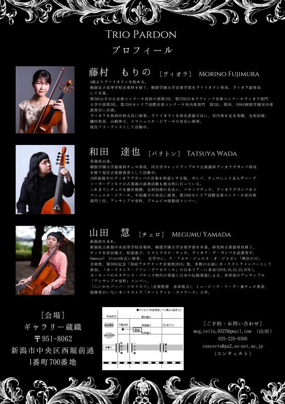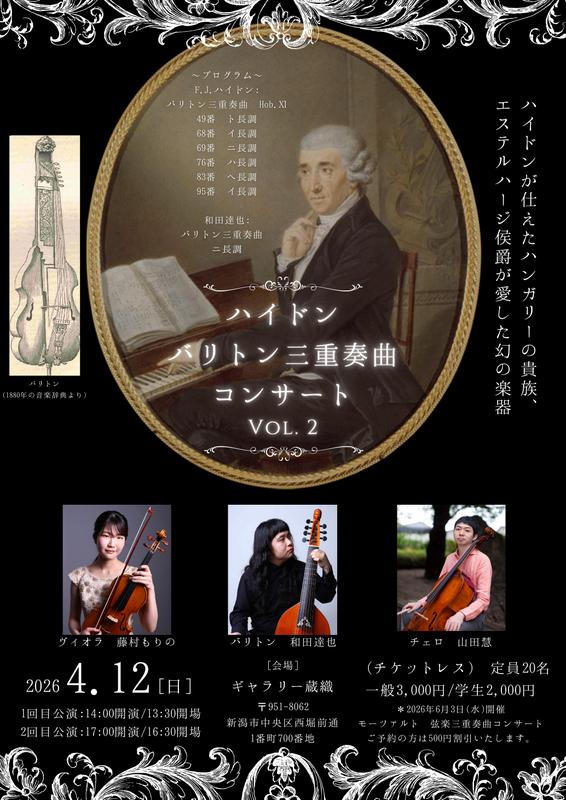 ハイドン バリトン三重奏コンサートvol.22026.4/12(日)会場:ギャラリー蔵織 蔵1階裏面あり 中央区 permalink こんな演奏会も。(終了したものもあります)関連したものがみつかりませんでした