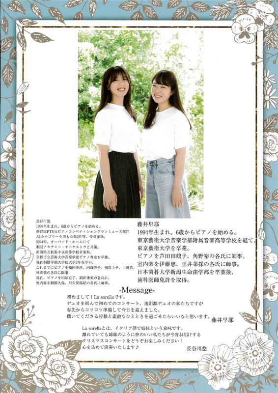 ピアノデュオ「ラ・ソレッラ」クリスマスコンサート2024.12/15(日)ピアノ 長谷川悠&藤井早耶会場:りゅーとぴあスタジオA裏面あり 中央区, チケット取扱 permalink こんな演奏会も。(終了したものもあります)関連したものがみつかりませんでした