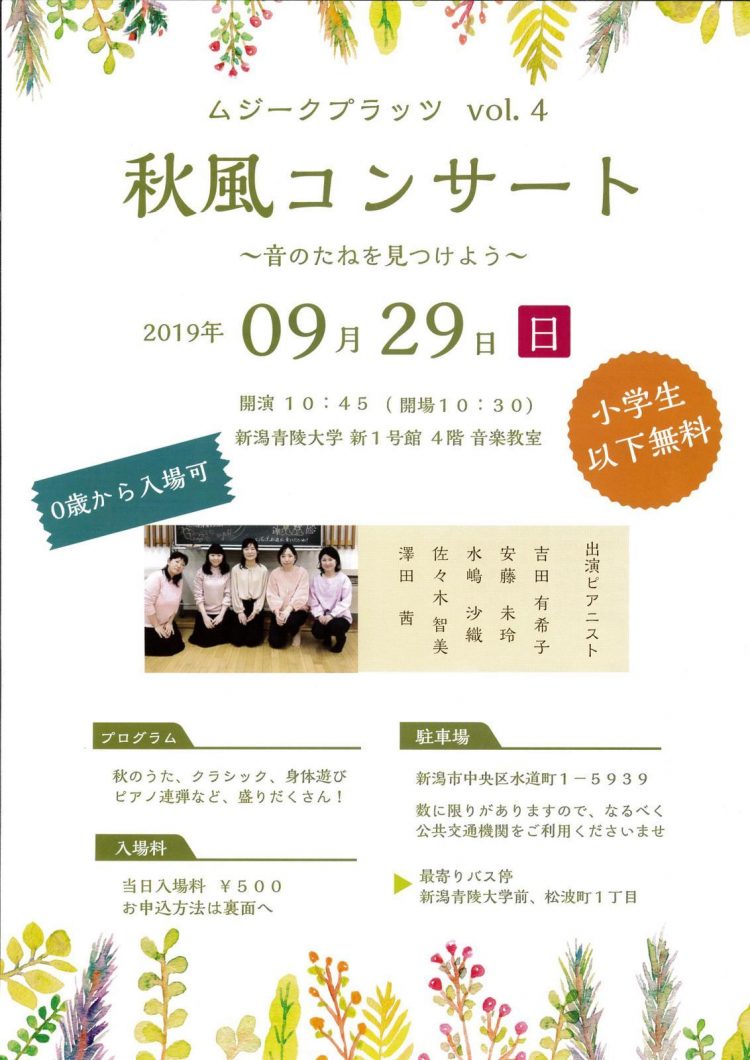 ムジークプラッツvol.42019.9/29(日)会場:青陵大学 新1号館 4階音楽室裏面あり。 中央区 permalink こんな演奏会も。(終了したものもあります)関連したものがみつかりませんでした