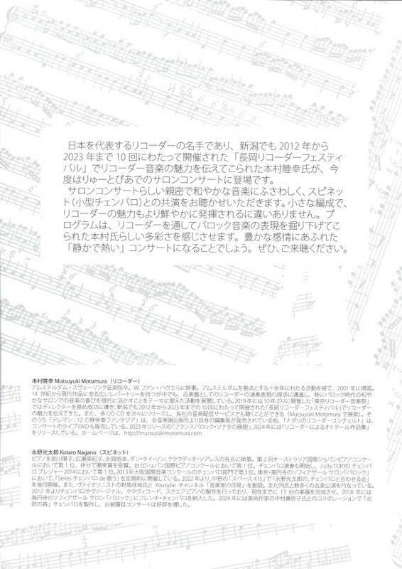 リコーダーとスピネットの対話2025.3/22(土)リコーダー本村睦幸 スピネット永野光太郎会場:りゅーとぴあスタジオA裏面あり 中央区, チケット取扱 permalink こんな演奏会も。(終了したものもあります)関連したものがみつかりませんでした