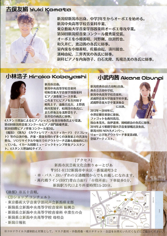 古俣友絹 オーボエ卒業記念演奏会2022.2/19(土)出演 ピアノ 小林浩子 ファゴット 小武内茜会場:りゅーとぴあスタジオA裏面あり。 中央区, チケット取扱 permalink こんな演奏会も。(終了したものもあります)関連したものがみつかりませんでした