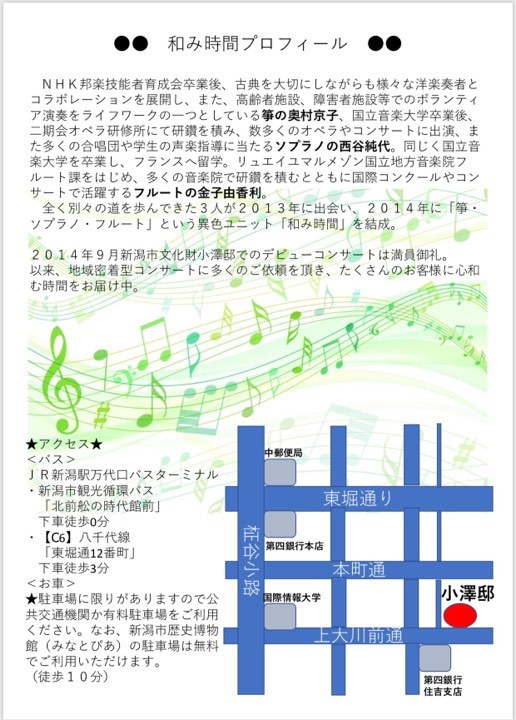 和み時間 五周年記念コンサート2019.5/26(日)ソプラノ西谷純代 フルート金子由香利 筝奥村京子会場:旧小澤家住宅 中央区, チケット取扱 permalink こんな演奏会も。(終了したものもあります)関連したものがみつかりませんでした