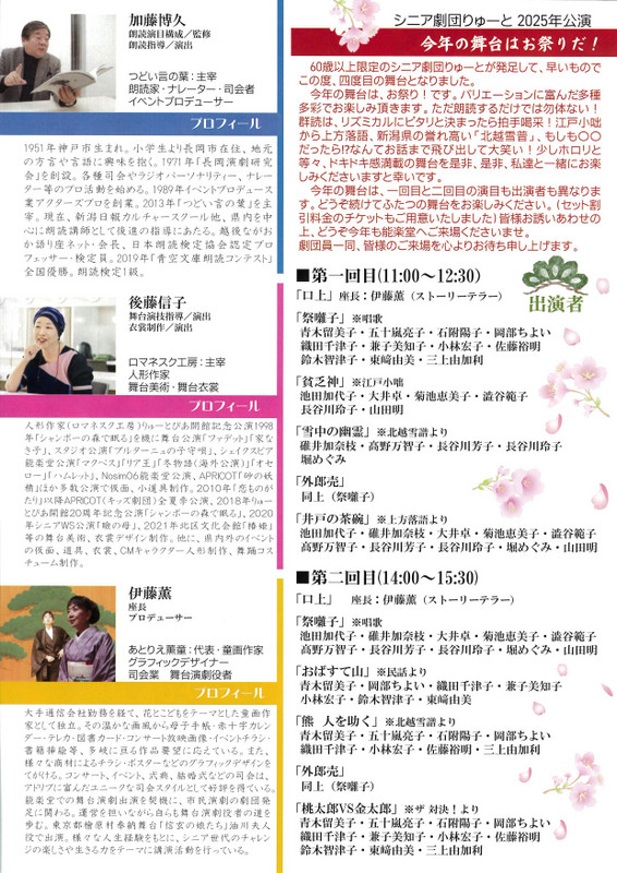 弥生三月祭囃子が聞こえる シニア劇団りゅーと公演2025.3/15(土)会場:りゅーとぴあ能楽堂裏面あり 中央区 permalink こんな演奏会も。(終了したものもあります)関連したものがみつかりませんでした