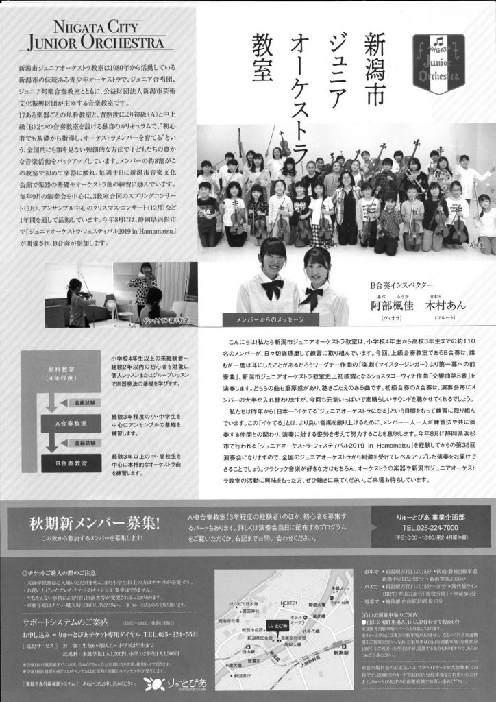 新潟市ジュニアオーケストラ教室 第38回演奏会2019.9/8(日)会場:りゅーとぴあコンサートホール裏面あり。 13:30よりロビーコンサートあり。 中央区 permalink こんな演奏会も。(終了したものもあります)関連したものがみつかりませんでした