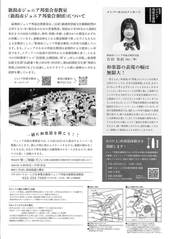 新潟市ジュニア邦楽合奏団 第29回定期演奏会2024.7/28(日)会場:りゅーとぴあコンサートホール裏面あり 中央区 permalink こんな演奏会も。(終了したものもあります)関連したものがみつかりませんでした