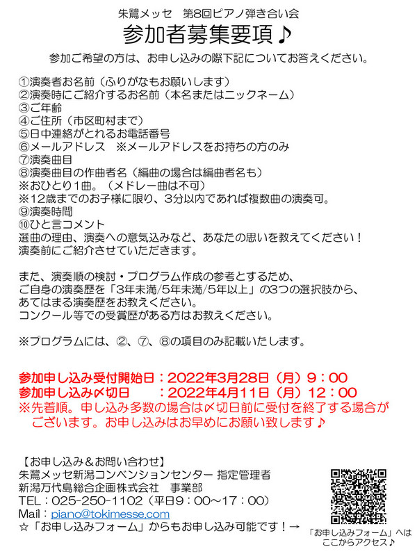 朱鷺メッセ 第8回ピアノ弾き合い会2022.4/23(土)会場:朱鷺メッセ アトリウム裏面あり。 中央区, 無料 permalink こんな演奏会も。(終了したものもあります)関連したものがみつかりませんでした