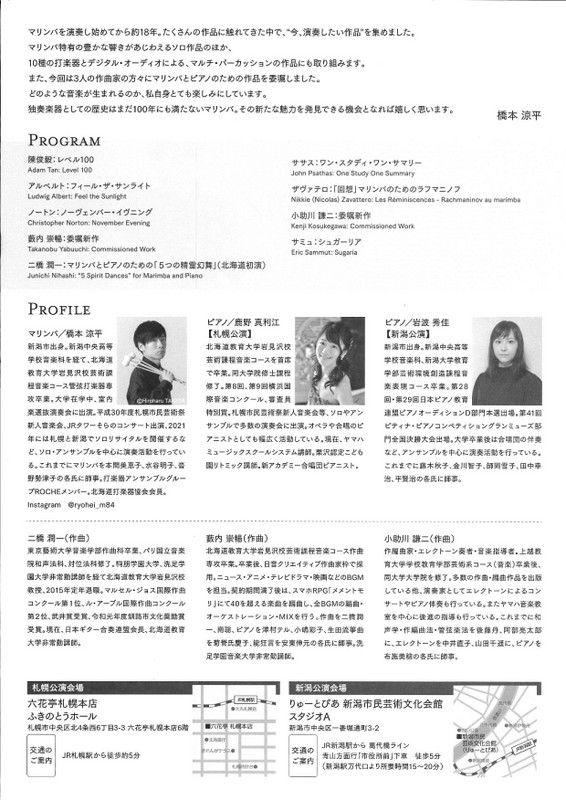 橋本涼平マリンバリサイタル2024.11/8(金)ピアノ 岩波秀佳会場:りゅーとぴあスタジオA裏面あり 中央区, チケット取扱 permalink こんな演奏会も。(終了したものもあります)関連したものがみつかりませんでした
