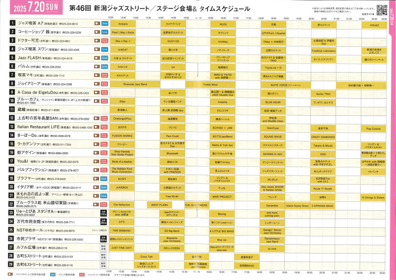 第46回 新潟ジャズストリート2025.7/20(日)会場:新潟市内29カ所裏面あり 中央区, チケット取扱 permalink こんな演奏会も。(終了したものもあります)関連したものがみつかりませんでした