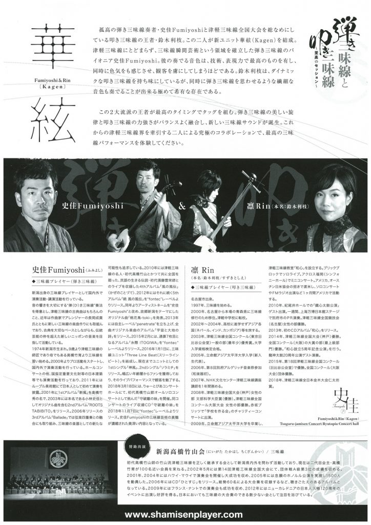 華絃 弾き三味線と叩き三味線2019.4/21(日)会場:りゅーとぴあコンサートホール裏面あり。 中央区 permalink こんな演奏会も。(終了したものもあります)関連したものがみつかりませんでした
