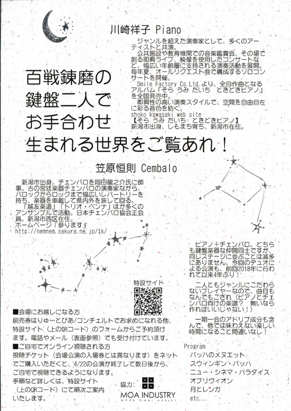 鍵盤世界へようこそ! 川崎祥子+笠原恒則2022.4/22(金)会場:りゅーとぴあスタジオA裏面あり。 中央区, チケット取扱 permalink こんな演奏会も。(終了したものもあります)関連したものがみつかりませんでした