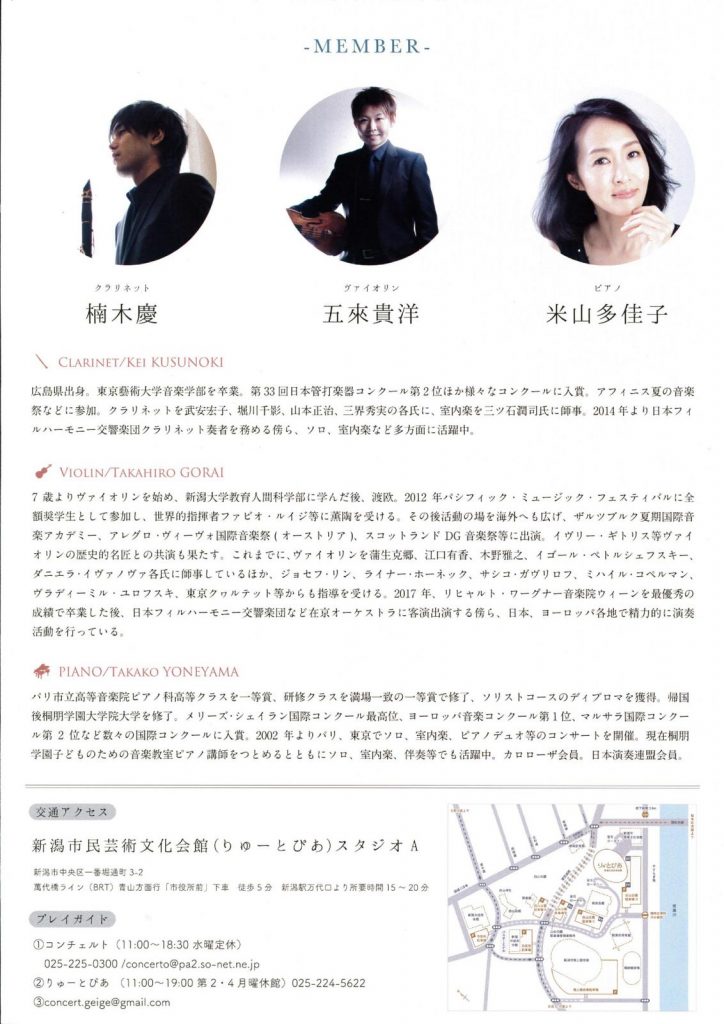 音楽を巡る ~フランスから東欧へ~2020.4/24(金)会場:りゅーとぴあスタジオA今回の公演は延期となりました。 中央区, チケット取扱 permalink こんな演奏会も。(終了したものもあります)関連したものがみつかりませんでした