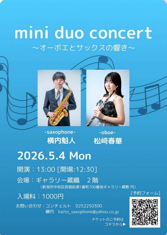 mini duo concert2026.5/4(月)サクソフォン 横内魁人 オーボエ 松﨑春華会場:ギャラリー蔵織 2階和室 中央区 permalink こんな演奏会も。(終了したものもあります)関連したものがみつかりませんでした