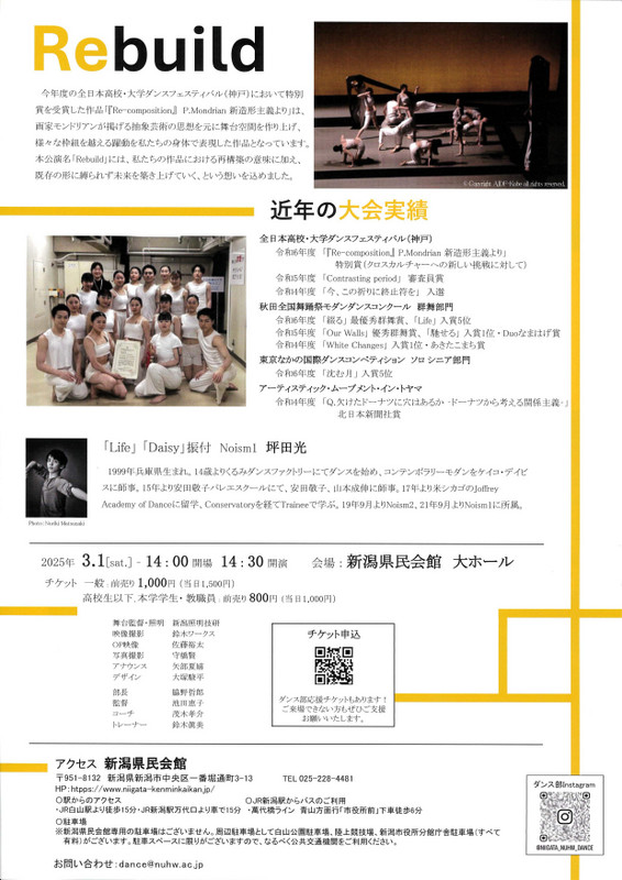 Re build 第12回新潟医療福祉大学ダンス部公演2025.3/1(土)会場:新潟県民会館裏面あり 中央区 permalink こんな演奏会も。(終了したものもあります)関連したものがみつかりませんでした
