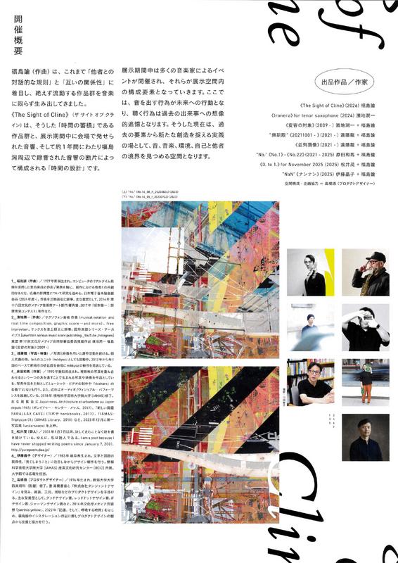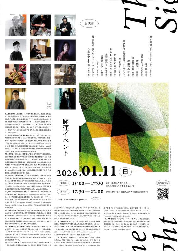 ザ・サイト・オブ・クライン 福島諭2026.1/11(日)会場:ビュー福島潟裏面・中面あり 展覧会としては1月10日より1月18日まで開催。 中央区以外 permalink こんな演奏会も。(終了したものもあります)関連したものがみつかりませんでした