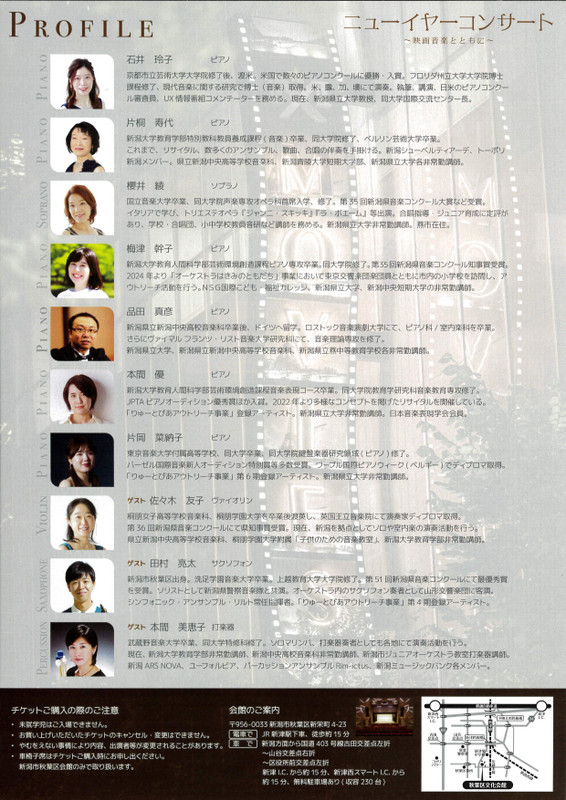 ニューイヤーコンサート 映画音楽とともに2026.1/11(日)会場:新潟市秋葉区文化会館裏面あり 中央区以外 permalink こんな演奏会も。(終了したものもあります)関連したものがみつかりませんでした