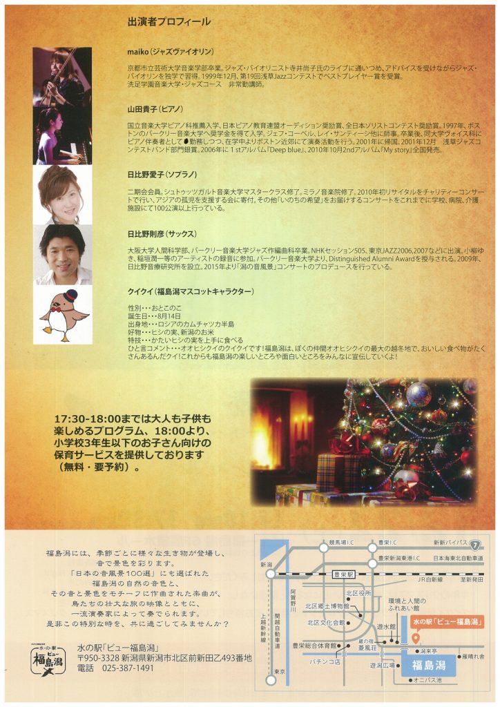 潟の音風景 クリスマススペシャルコンサート2018.12/22(土)会場:ビュー福島潟6階展望ホール裏面あり。 中央区以外 permalink こんな演奏会も。(終了したものもあります)関連したものがみつかりませんでした