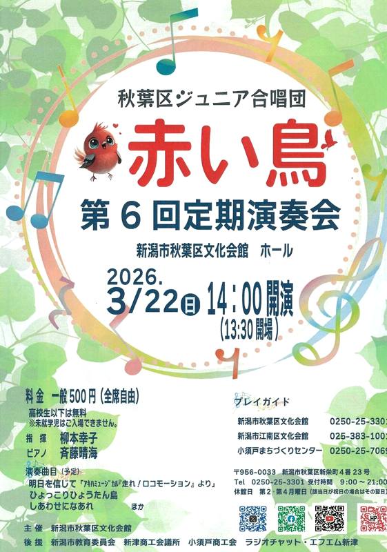 秋葉区ジュニア合唱団赤い鳥 第6回定期演奏会2026.3/22(日)会場:新潟市秋葉区文化会館 中央区以外 permalink こんな演奏会も。(終了したものもあります)関連したものがみつかりませんでした