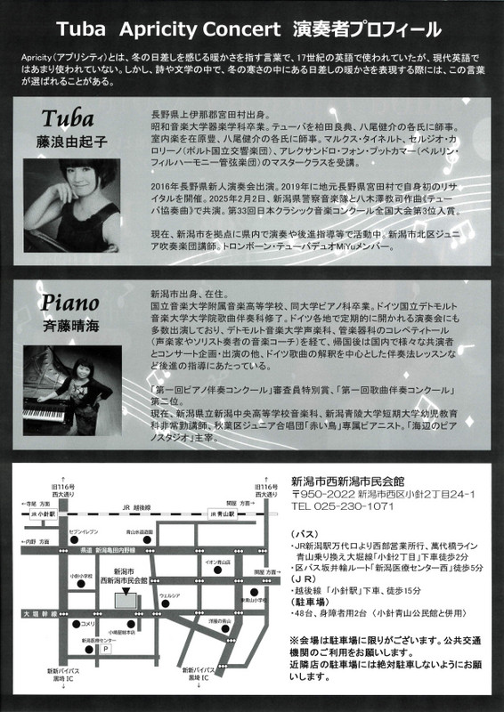 テューバ アプリシティコンサート2025.11/2(日)テューバ 藤浪由起子 ピアノ 斉藤晴海会場:西新潟市民会館裏面あり 中央区以外, 無料 permalink こんな演奏会も。(終了したものもあります)関連したものがみつかりませんでした