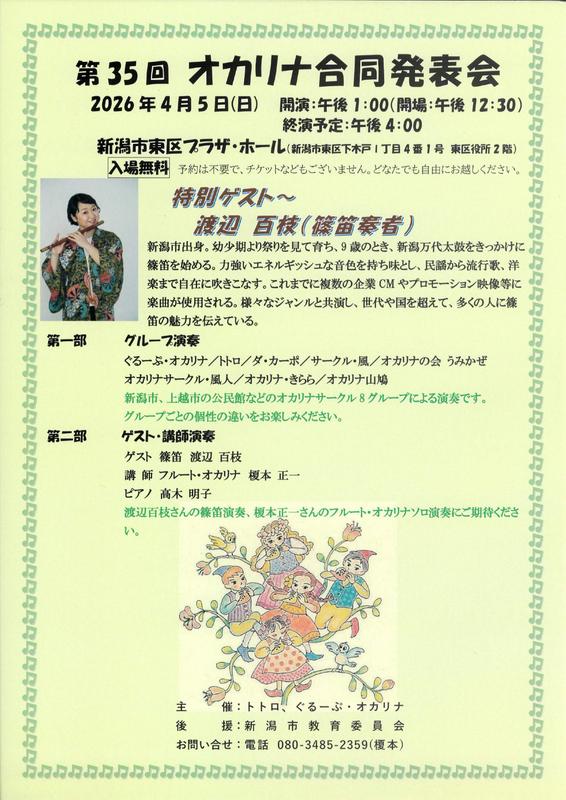 第35回 オカリナ合同発表会2026.4/5(日)ゲスト 篠笛渡辺百枝会場:東区プラザホール 中央区以外, 無料 permalink こんな演奏会も。(終了したものもあります)関連したものがみつかりませんでした