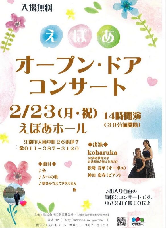 えぽあオープンドアコンサート2026.2/23(月)新潟市出身オーボエ松崎春華さん出演会場:(北海道)えぽあホール 県外, 無料 permalink こんな演奏会も。(終了したものもあります)関連したものがみつかりませんでした