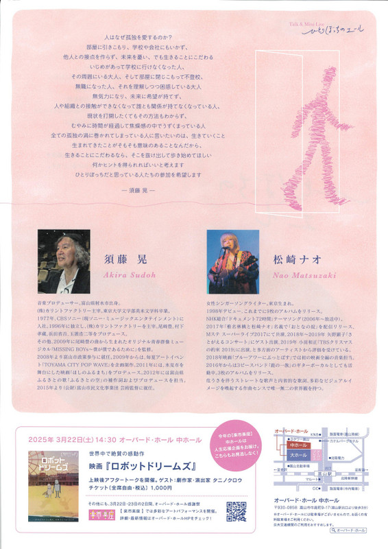 ひとりぼっちのエール2025.3/23(日)会場:(富山県)オーバード・ホール 中ホール裏面あり 県外, 無料 permalink こんな演奏会も。(終了したものもあります)関連したものがみつかりませんでした