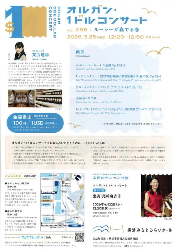 オルガン 1ドルコンサート2026.3/25(水)会場:(神奈川県)横浜みなとみらい大ホール裏面あり 県外 permalink こんな演奏会も。(終了したものもあります)関連したものがみつかりませんでした