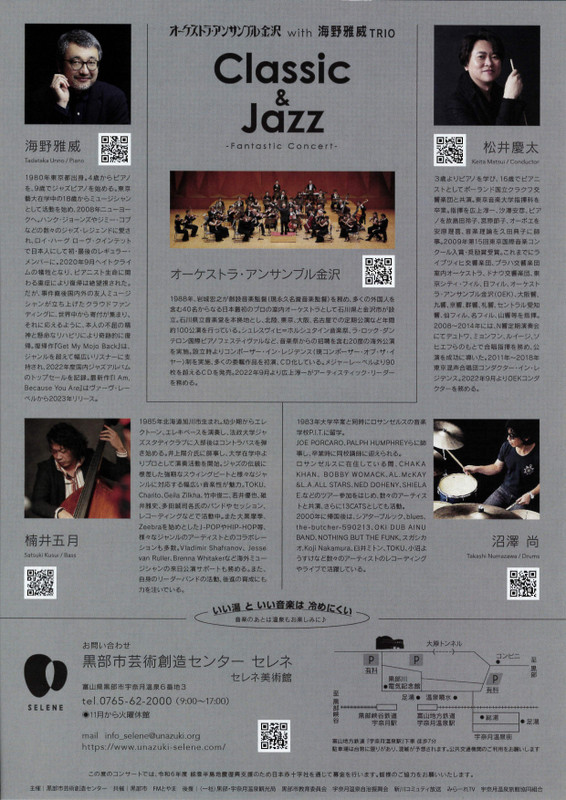 オーケストラアンサンブル金沢 クラシック&ジャズ2024.12/2(月)会場:(山形県)黒部市創造芸術センターセレネ裏面あり 県外 permalink こんな演奏会も。(終了したものもあります)関連したものがみつかりませんでした
