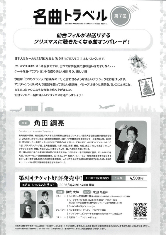 仙台フィル 名曲トラベル2025.12/24(水)会場:(宮城県)日立システムズホール仙台コンサートホール裏面あり 県外 permalink こんな演奏会も。(終了したものもあります)関連したものがみつかりませんでした