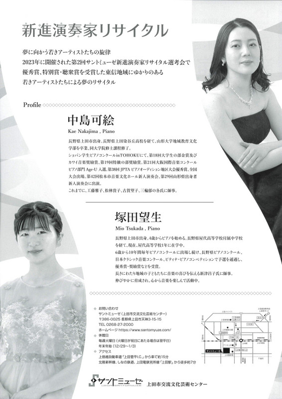 第2回サントミューゼ新進演奏家リサイタル2025.2/2(日)会場:(長野県)サントミューゼ裏面あり 県外 permalink こんな演奏会も。(終了したものもあります)関連したものがみつかりませんでした