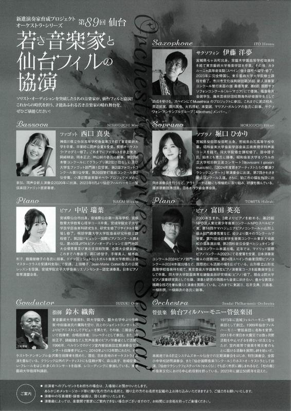 若き音楽家と仙台フィルの協演2026.2/7(土)会場:(宮城県)日立システムズホール仙台コンサートホール裏面あり 県外 permalink こんな演奏会も。(終了したものもあります)関連したものがみつかりませんでした