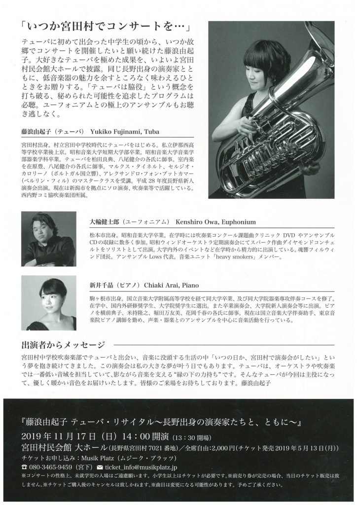藤浪由起子 テューバ・リサイタル2019.11/17(日)会場:(長野県)宮田村民会館大ホール裏面あり。 県外 permalink こんな演奏会も。(終了したものもあります)関連したものがみつかりませんでした