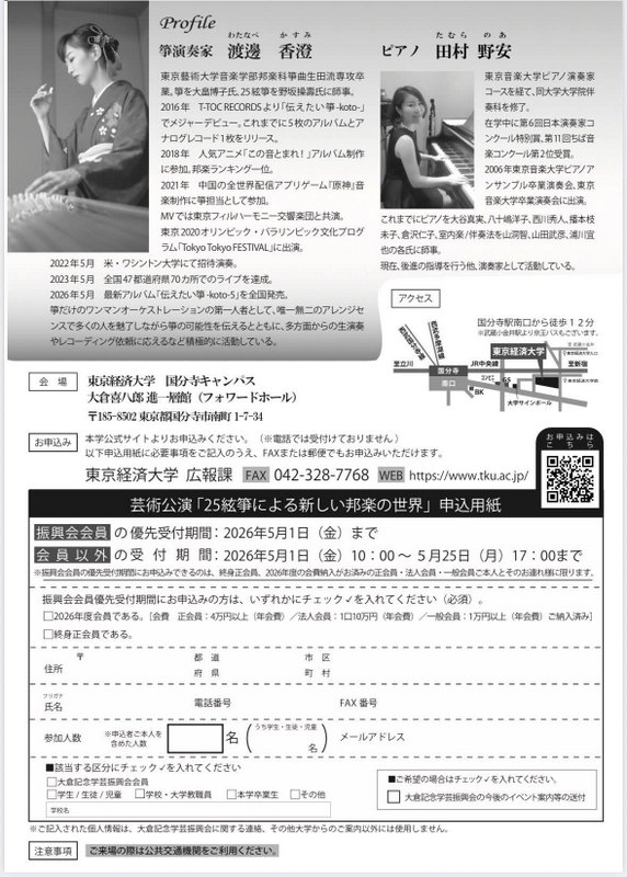 25弦筝による新しい邦楽の世界 渡邊香澄2026.5/30(土)会場:(東京都)東京経済大学国分寺キャンパス裏面あり 県外 permalink Screenshotこんな演奏会も。(終了したものもあります)関連したものがみつかりませんでした
