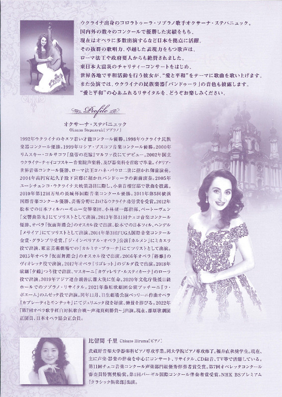 オクサーナ・ステパニュック ソプラノリサイタル2023.11/19(日)会場:越後妻有文化ホール 団十ろう裏面あり 新潟市外 permalink こんな演奏会も。(終了したものもあります)関連したものがみつかりませんでした