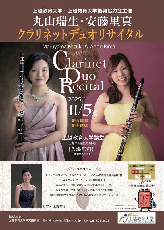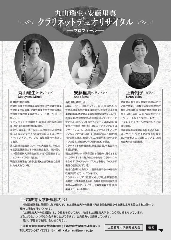 クラリネットデュオリサイタル 丸山瑞生・安藤里真2025.11/5(水)会場:上越教育大学講堂裏面あり 新潟市外, 無料 permalink こんな演奏会も。(終了したものもあります)関連したものがみつかりませんでした