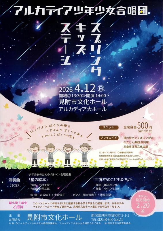 スプリングキッズステージ アルカディア少年少女合唱団2026.4/12(日)会場:見附市文化ホールアルカディア 新潟市外 permalink こんな演奏会も。(終了したものもあります)関連したものがみつかりませんでした