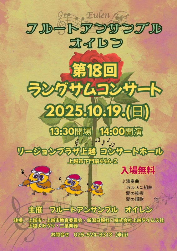 フルートアンサンブルオイレン 第18回ラングサムコンサート2025.10/19(日)会場:リージョンプラザ上越コンサートホール 新潟市外, 無料 permalink こんな演奏会も。(終了したものもあります)関連したものがみつかりませんでした