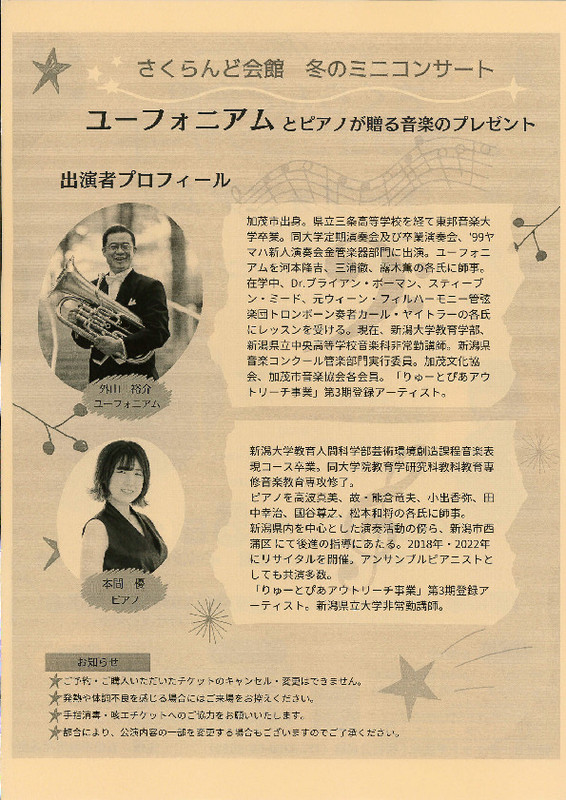ユーフォニアムとピアノが語る音楽のプレゼント2023.12/5(火)会場:五泉市さくらんど会館裏面あり 新潟市外 permalink こんな演奏会も。(終了したものもあります)関連したものがみつかりませんでした