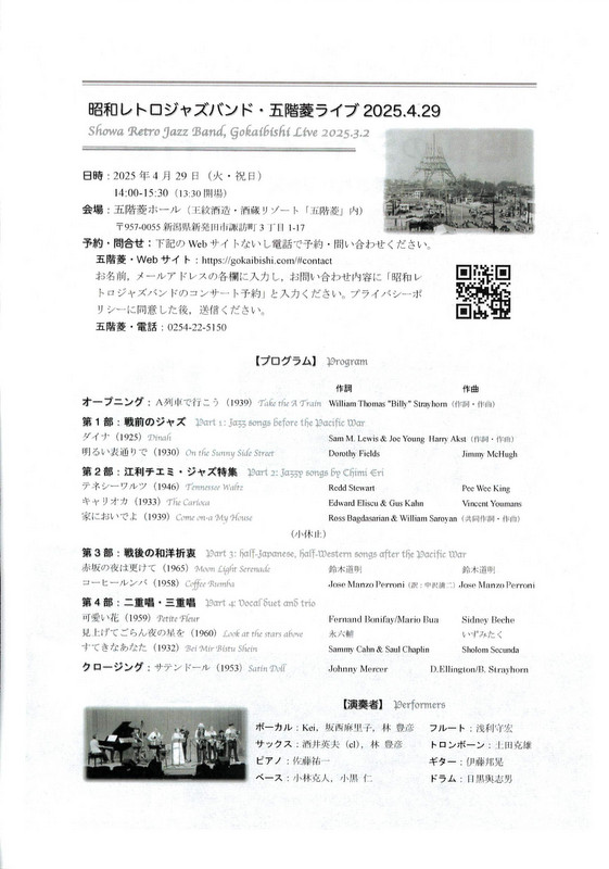 昭和のジャズと流行歌 江利チエミ特集2025.4/29(火)昭和レトロジャズバンド会場:酒蔵リゾート五階菱裏面あり 新潟市外 permalink こんな演奏会も。(終了したものもあります)関連したものがみつかりませんでした