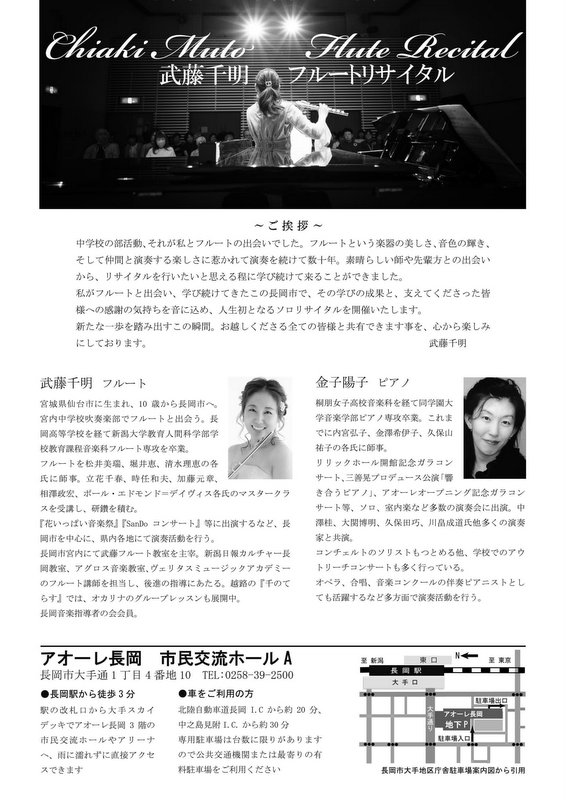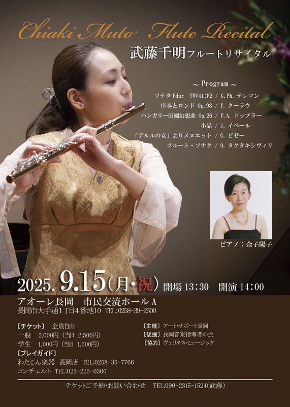 武藤千明 フルートリサイタル2025.9/15(月)会場:アオーレ長岡市民交流ホールA裏面あり。 新潟市外, チケット取扱 permalink こんな演奏会も。(終了したものもあります)関連したものがみつかりませんでした