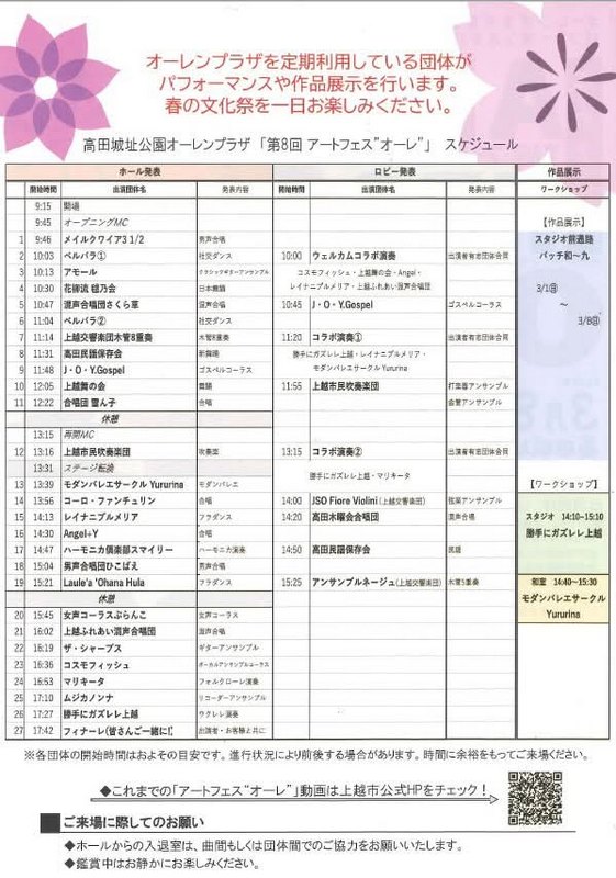 第8回アートフェス オーレ2026.3/8(日)会場:高田城址公園オーレンプラザホール裏面あり 新潟市外, 無料 permalink こんな演奏会も。(終了したものもあります)関連したものがみつかりませんでした