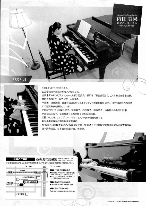内田美果ピアノリサイタル 私の心に残る曲2023.9/18(月)会場:西新潟市民会館 多目的ホール裏面あり 中央区以外, チケット取扱 permalink こんな演奏会も。(終了したものもあります)関連したものがみつかりませんでした