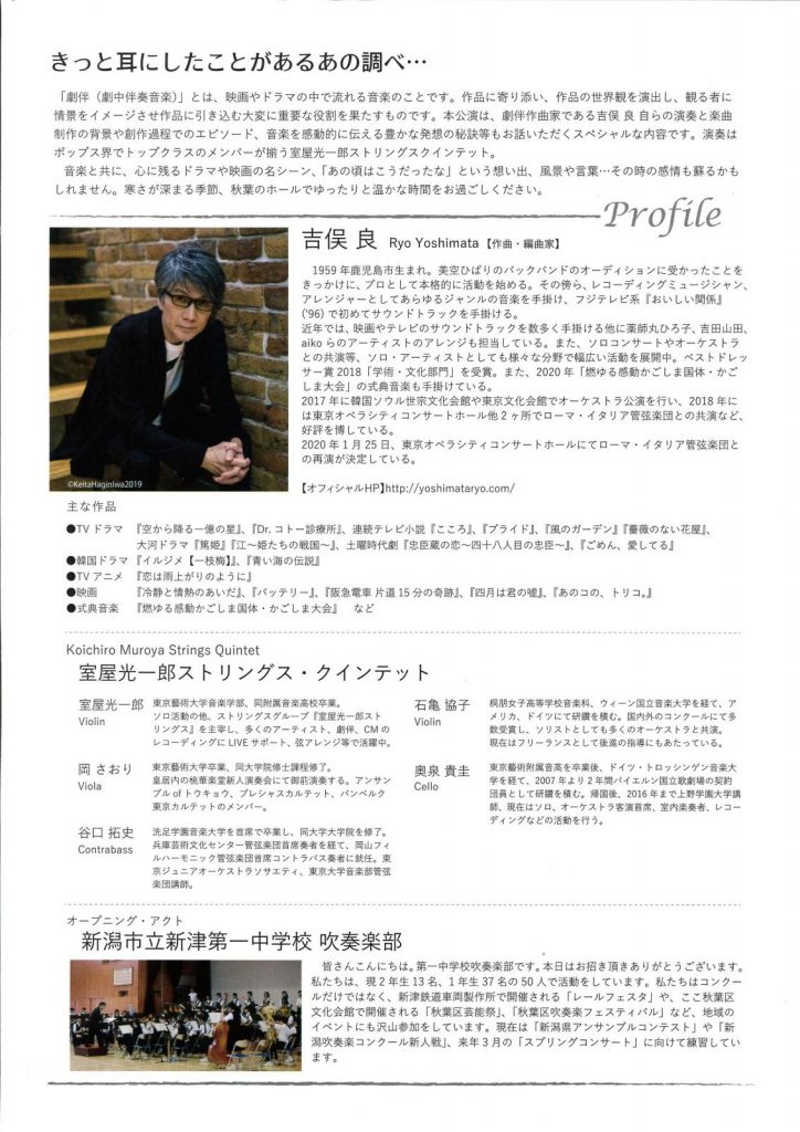吉俣良 サウンドトラックコンサート2019.12/7(土)会場:新潟市秋葉区文化会館裏面あり。 中央区以外, チケット取扱 permalink こんな演奏会も。(終了したものもあります)関連したものがみつかりませんでした
