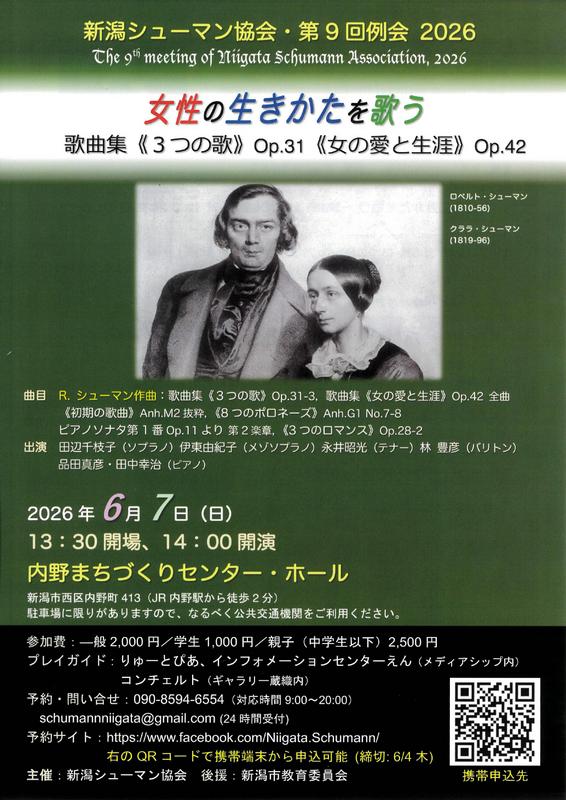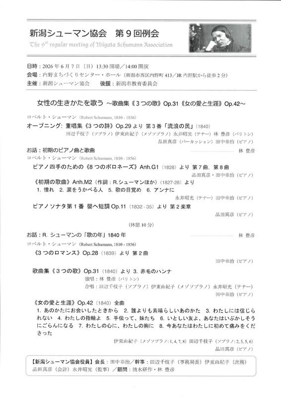 新潟シューマン協会 第9回例会2026.6/7(日)会場:内野まちづくりセンター裏面あり 中央区以外, チケット取扱 permalink こんな演奏会も。(終了したものもあります)関連したものがみつかりませんでした